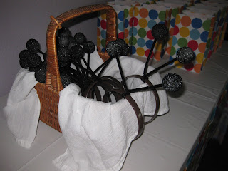 For the entry way I had 3 tables set up. One with a 'make your own caterpillar' station, another with handmade antenna's to wear and gift bags, and the last one for the gifts. Each gift bag contained a slinky, caterpillar key chain, stickers, butterfly lollipop and crayons. We made the antennas with brown headbands, black pipe cleaners and little styrofaom balls spray-painted black.